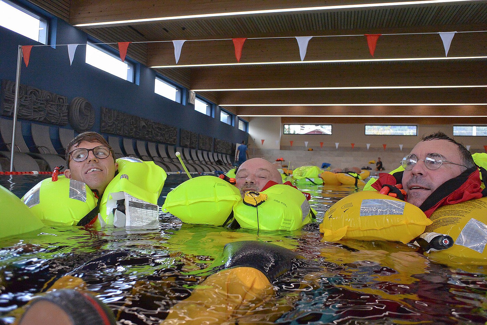 Am Tag zwei ging es ans Eingemachte. Im Hallenbad Telfs merkten wir dann am eigenen Leib, wie schwierig es ist, in voller Schwerwettermontur und mit aktivierter Automatikweste im Wasser eine Formation zu bilden oder gemeinsam in eine Richtung zu schwimmen.