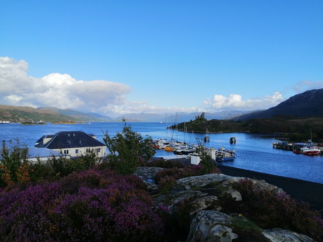 Heute ist Rotina mit dem Anlegen dran. Nach Ruderübergabe kurz vor der Skye Bridge legt sie nach einer Übersichtsrunde im kleinen, engen Hafen am Schwimmsteg längsseits im Päckchen an einem Glasboden-Ausflugsboot mit Crewunterstützung an. Die „Sleat Odyseey“ folgt eine halbe Stunde später.